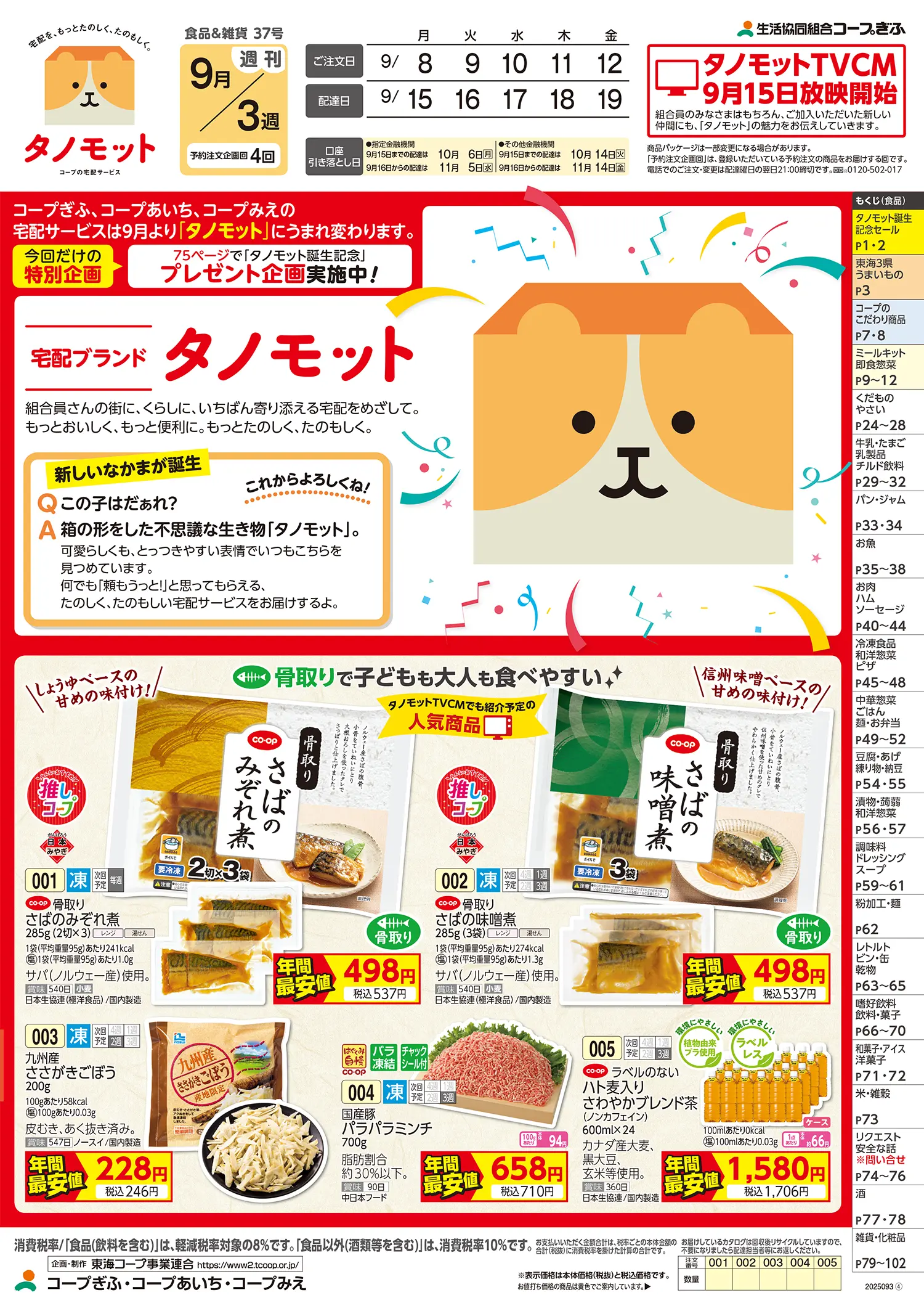 週に1回、決まった曜日に週刊タノモット(カタログ)をお届けし、翌週にご注文、翌々週に商品のお届けいたします。(商品お届け時に翌々週の商品カタログをお届けします。)配達曜日と時間帯はお住まいの地域ごとに異なります。