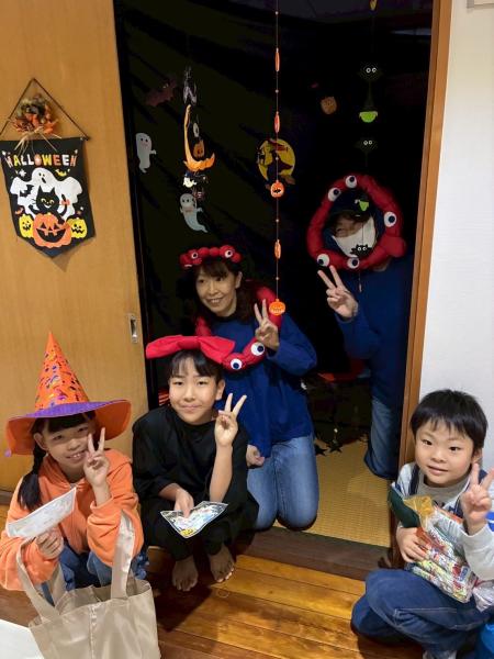 > ハロウィンで仮装してお菓子を配る