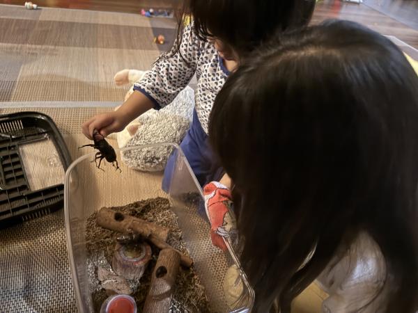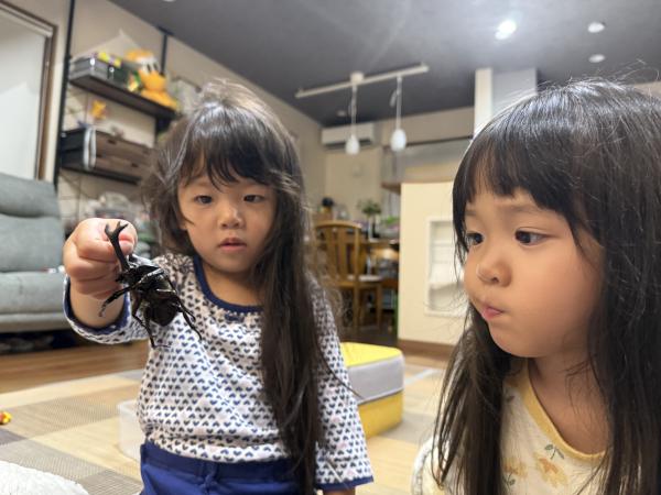こどもたちは初めて生き物を飼育しました。娘が「自分でお世話する!」と意気込んで、譲り受けたカブトムシの飼育を始めましたが、怖いといって触れませんでした。でも朝から山に行きカブトムシのお友達を捕まえたり、一緒に過ごす時間が多くなるにつれ、ケースの掃除の際など触れるようになりました。卵も生まれて、幼虫も今も育てていますが、そちらはまだ触れないようです。カブトムシの成虫は9月〜10月の頭ごろには5匹いたカブトムシたちは死んでしまい、カブトムシたちは幸せだったかな?と深い話もできました。 命の勉強にもなったと思います。