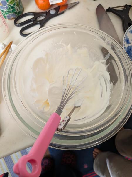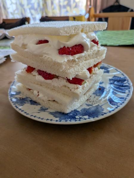 子どもとお菓子づくりをしたかったですが、初めてなので簡単なもので、いちごがたくさんのサンドをつくりました。生クリームは手動なので疲れましたが、思う存分いちごが入れられて満足でした。