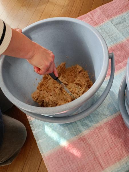 米麴、麦麹、塩をほぐして混ぜたところに、柔らかく煮て潰した大豆を混ぜて作りました。 お喋りしながらの力仕事だったので、楽しく協力してできました。食べる時期が待ち遠しいと、皆さんの感想がありました。