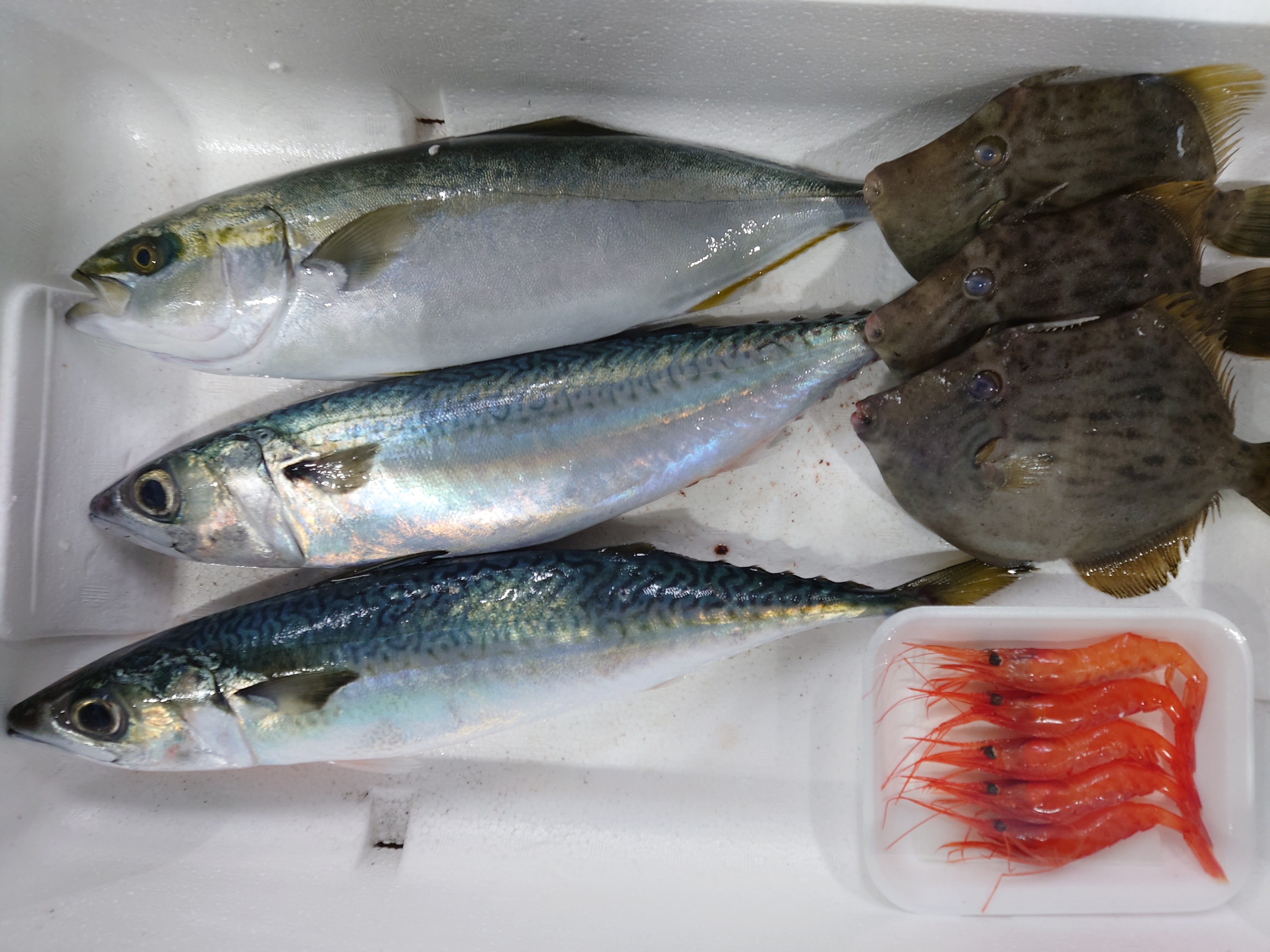 左上:ツバス(ふくらぎ)(魚津漁港) 右上:カワハギ(魚津漁港) 左下:真さば(魚津漁港) 右下:甘えび(岩瀬漁港)