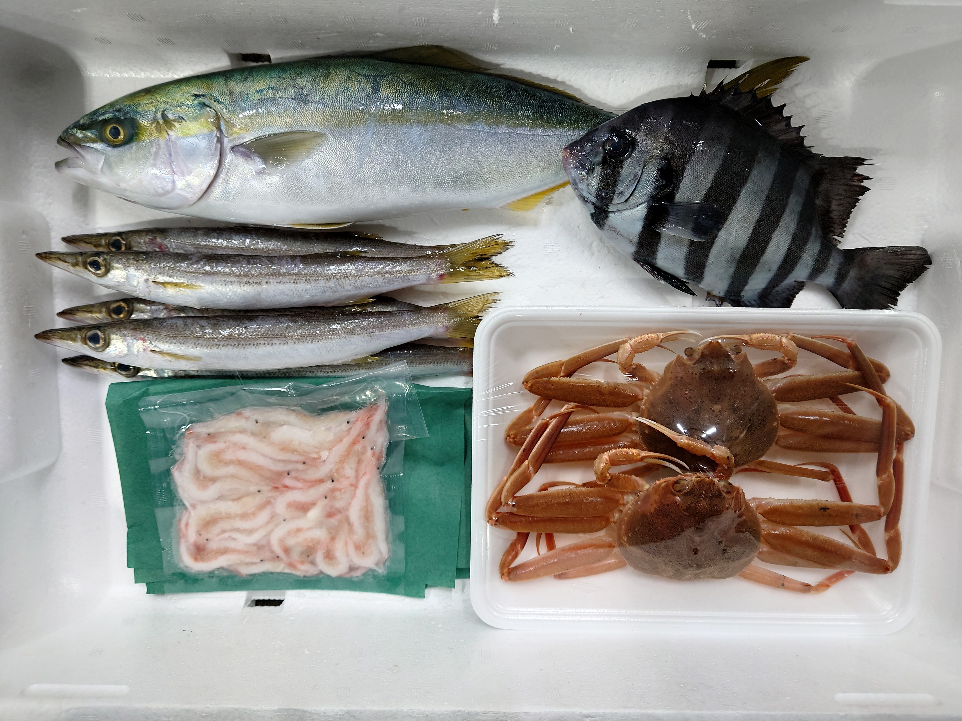 左上:ツバス(ふくらぎ)(魚津漁港) 右上:イシダイ(魚津漁港) 左真ん中:カマス(氷見漁港) 左下:白エビ(岩瀬漁港) 右下:香箱ガニ(魚津漁港)