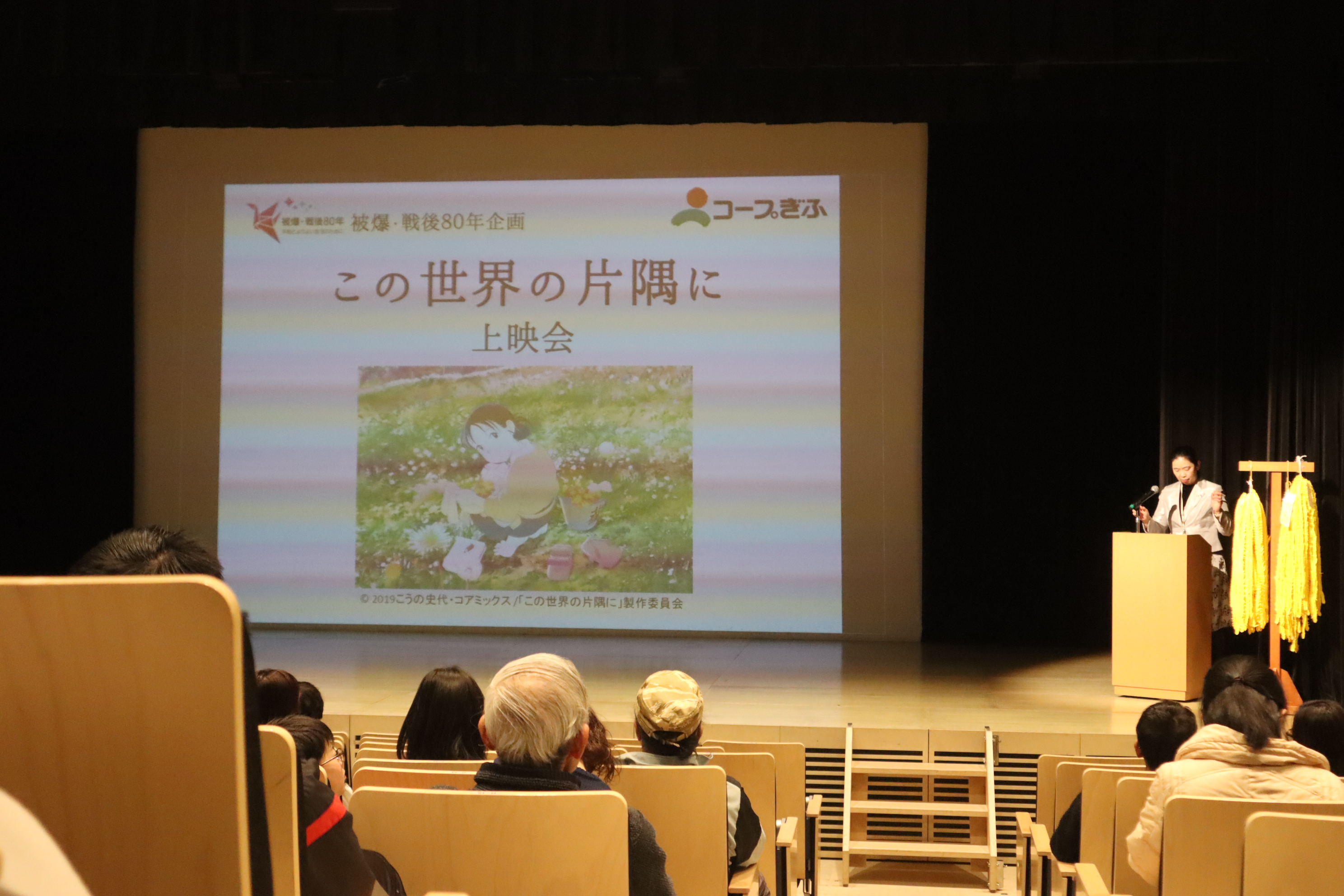 今回上映した映画「この世界の片隅に」は、戦時中の広島を舞台に一人の女性がどのような生活をしていたのか、喜怒哀楽を交えながら描かれたアニメーション映画です。戦争という難しいテーマでありながらも、素朴で柔らかなシーンもあり、戦時中を生きた人々も今のわたしたちと変わらず笑い、喜びを見つけながら生きてきた様子が描かれています。