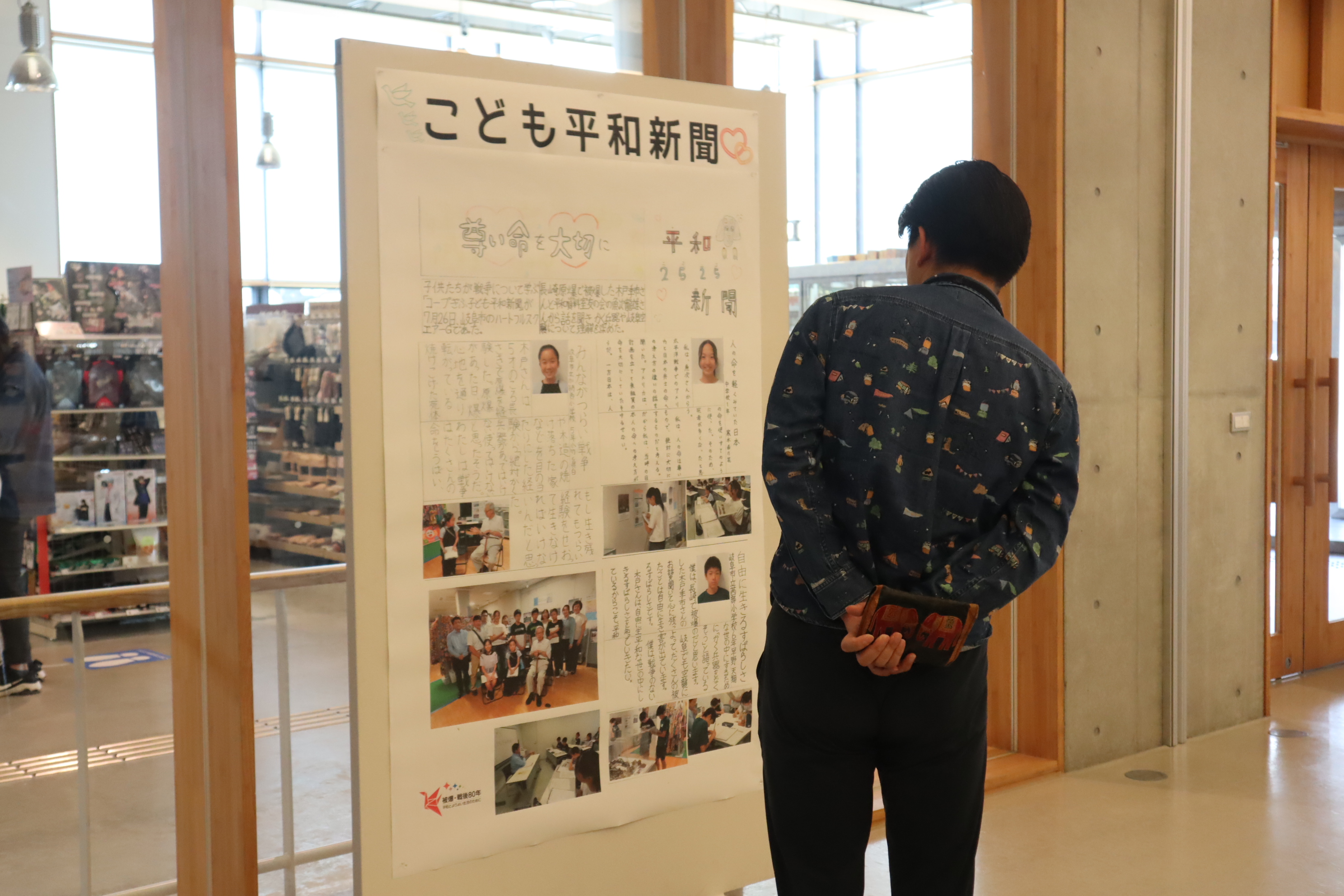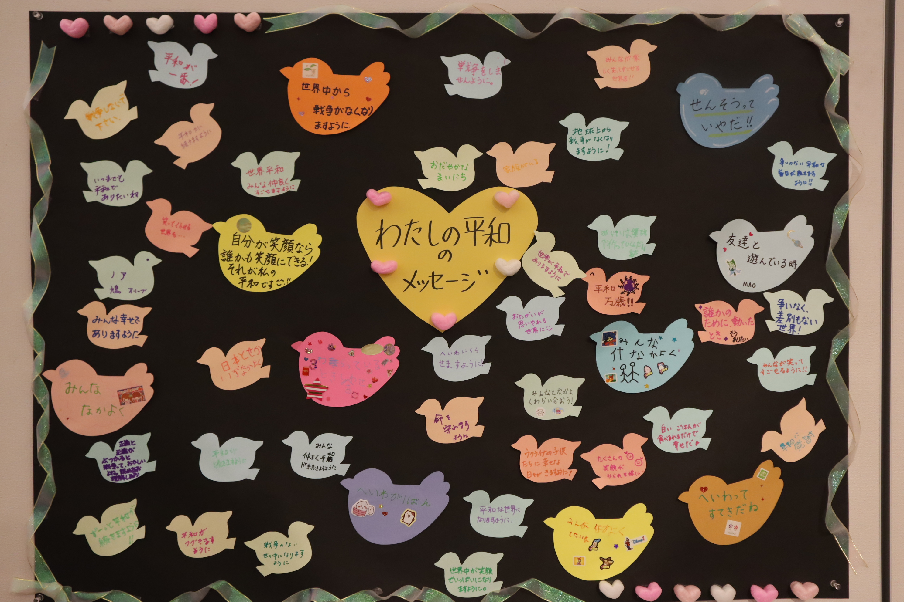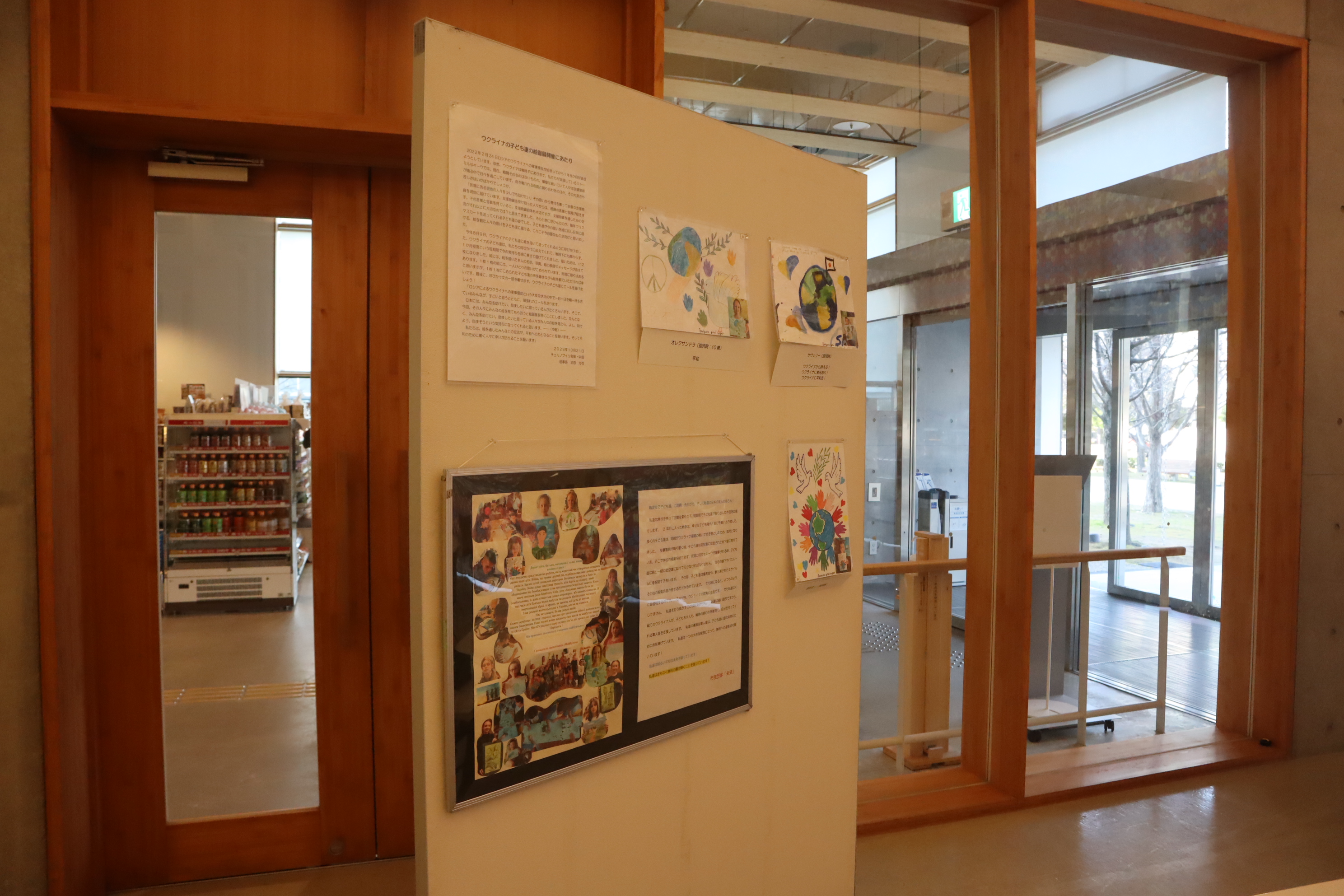 また当日はメディアコスモス内の別スタジオにて、平和展示・ワークショップを開催しました。こちらにも多くの方にご来場いただき、ウクライナの子どもたちが描いた絵やコープぎふの取り組み展示をご覧いただいたほか、平和のモチーフを使ったビーズストラップ・しおりづくりや、折り鶴折り、絵本コーナー、平和へのメッセージボードなど、さまざまな企画にご参加いただきました。