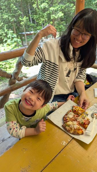 やっぱり自分で作ったこと、自然の中で食べるピザはとってもおいしいです♪