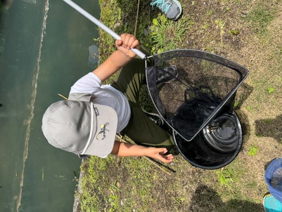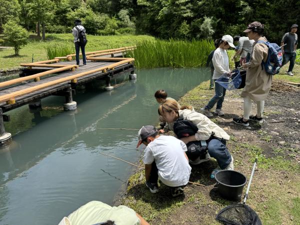ピザを食べた後は、なかなかできない「ザリガニ釣り」などを体験!