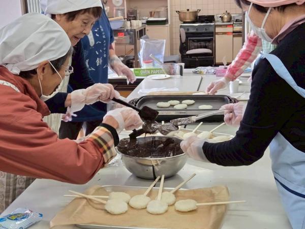 小坂町で五平餅を販売されている講師の方をお招きし、えごまのたれの作り方から焼き方まで丁寧に教えていただきました。