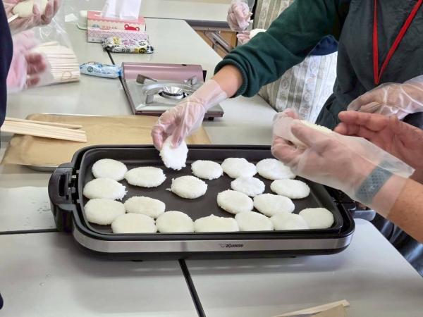 炊きたてのご飯をつぶして形を整え、えごまの香ばしいたれを塗ってホットプレートで焼き上げる工程は、初めての方にも好評でした。