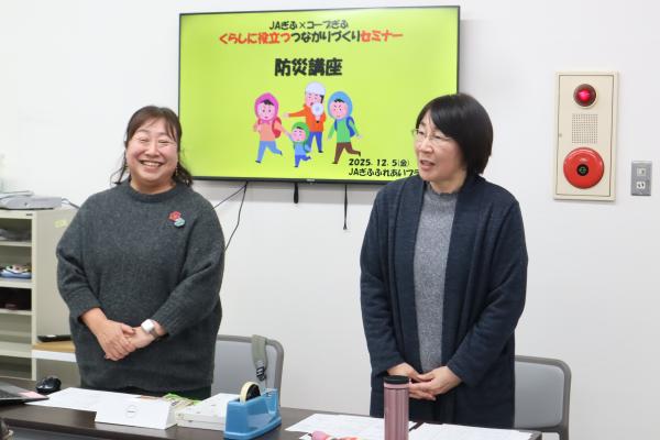 JAぎふとコープぎふは包括連携協定に基づき、組合員や地域のくらしに役立つ取り組みをいっしょに進めています。その一環として、12月5日(金)、JAぎふふれあいプラザ方県において「楽しく学べる防災セミナー」を開催しました。