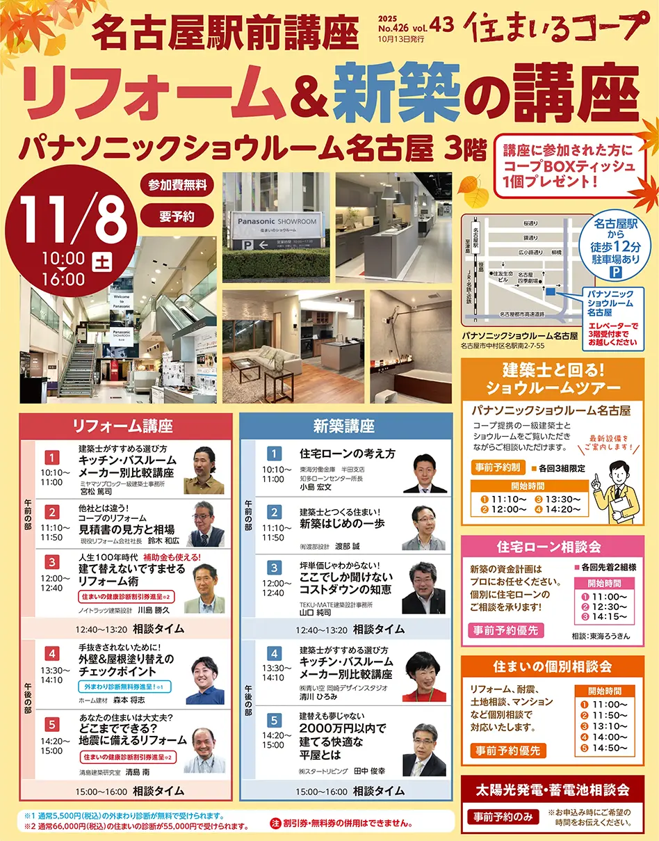 住まいのプロ(一級建築士や専門取引先)が、新築/リフォームの大切なポイントや、相談の多い事例の解決策など、組合員さんのお悩みのお手伝いをさせていただきます。