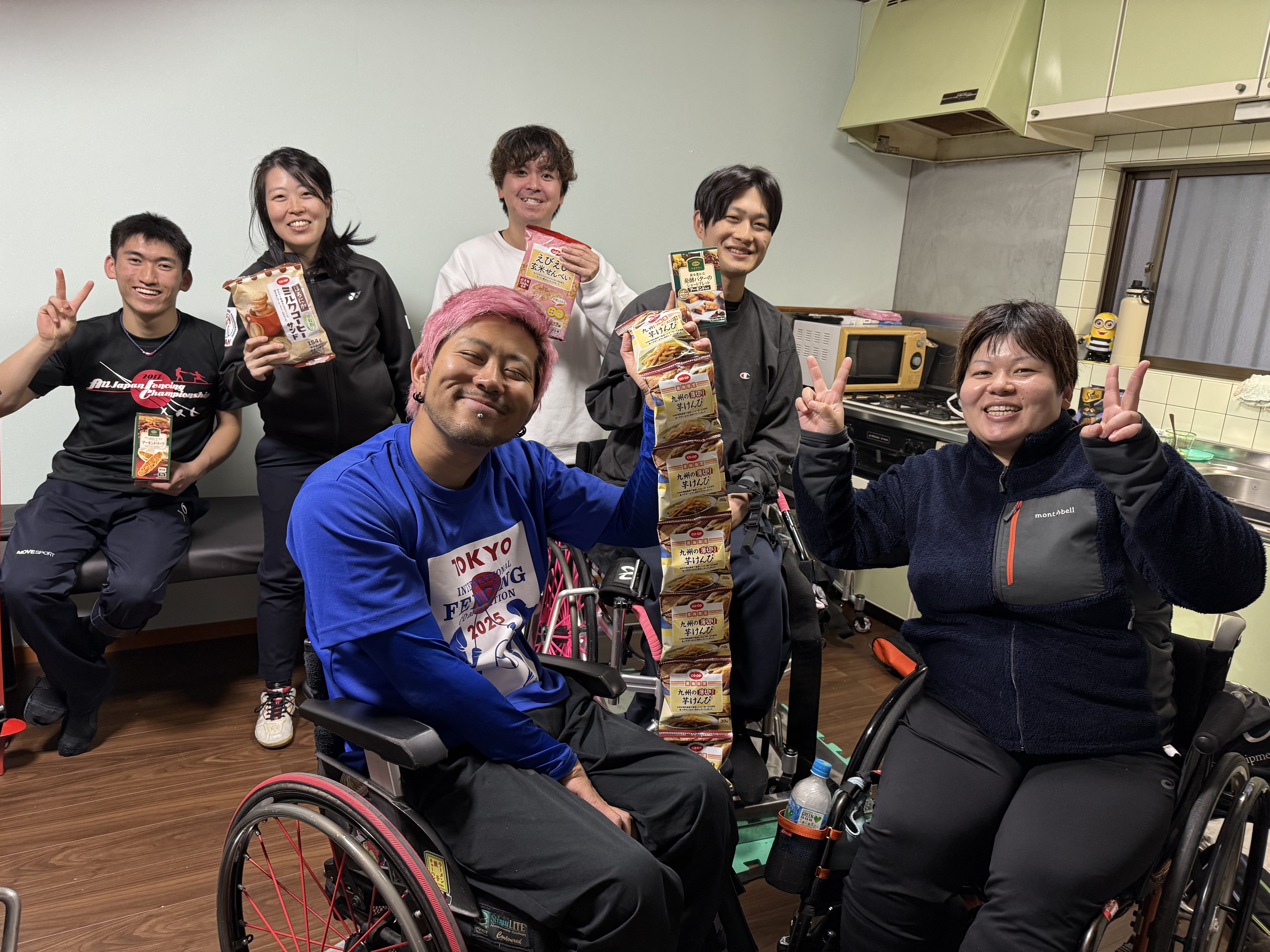 私達選手は障害を抱えながら、車椅子生活や補装具を足につけたりして、自分で設定した目標に向かって練習しています。練習は集中しますが、練習後はチームには理学療法士も所属している為、体のことを相談したり、生活のことを当事者同士で相談したりと人を大切に、感謝の気持ちを大切に練習しています。 生協ってこんな商品があるんだ!また食べたい!など和やかな雰囲気になりました。