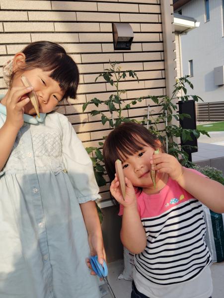 子供達と何を作るか相談し、好きなオクラとキュウリを作ることにしました。下の子はオクラやキュウリがどうやってなるのか、上の子は初めてオクラの収穫前の状況を見て驚きの連続でした。オクラは1種類はダメになってしまいましたが、下の子がちっちゃくなっているオクラを可愛がっているのでそのままにしてあります。それぞれ保育園・小学校から帰宅すると、一生懸命水やりをして、時にはどっちが先に水やりするかで、喧嘩しながらも、お世話をする事が出来ました。2人にとって良い経験になったと思います。