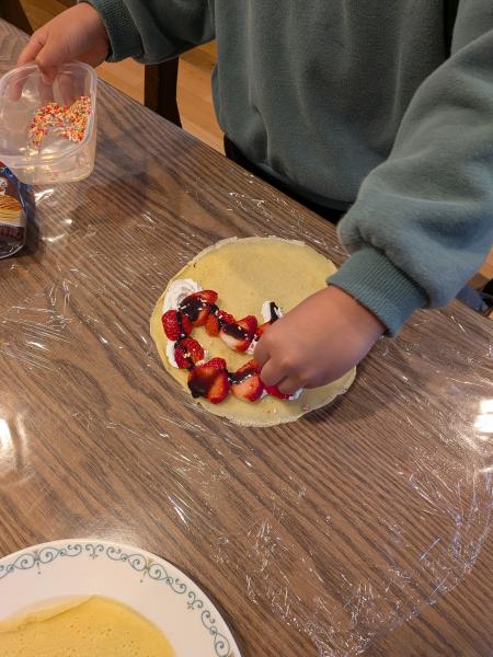 おやつに、自分で好きなトッピングしたクレープを食べる事をしました。 自分で作るとよりおいしいのか、何回も作って食べてました。今度は生地を焼くとろからも挑戦したいです。