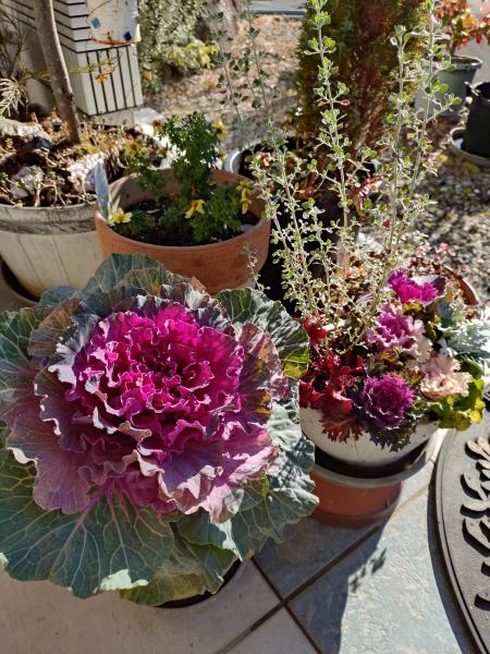 お正月が近くなり玄関周り寂しかったので、初めて葉牡丹の寄せ植えを作りました。ネットで好みの寄せ植えを探して、それに近い苗を買ってきて植え込みました。玄関前が華やかな雰囲気になりました。