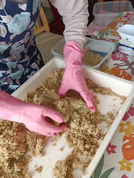 米麴、麦麹、塩をほぐして混ぜたところに、柔らかく煮て潰した大豆を混ぜて作りました。 お喋りしながらの力仕事だったので、楽しく協力してできました。食べる時期が待ち遠しいと、皆さんの感想がありました。