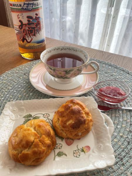 三河みりんが大好きでいつもお料理に使用しています。今回はスイーツで使ってみたいと思いチャレンジしました。「わたしに優しい米粉とみりんのお菓子と料理」という書籍から、米粉とみりんのバタースコーンといちごのみりんコンフィチュールを作りました。 みりんの優しい甘さでとても美味しくできて、楽しいティータイムになりました。みりんを使ってまた色々作ってみたいと思います。