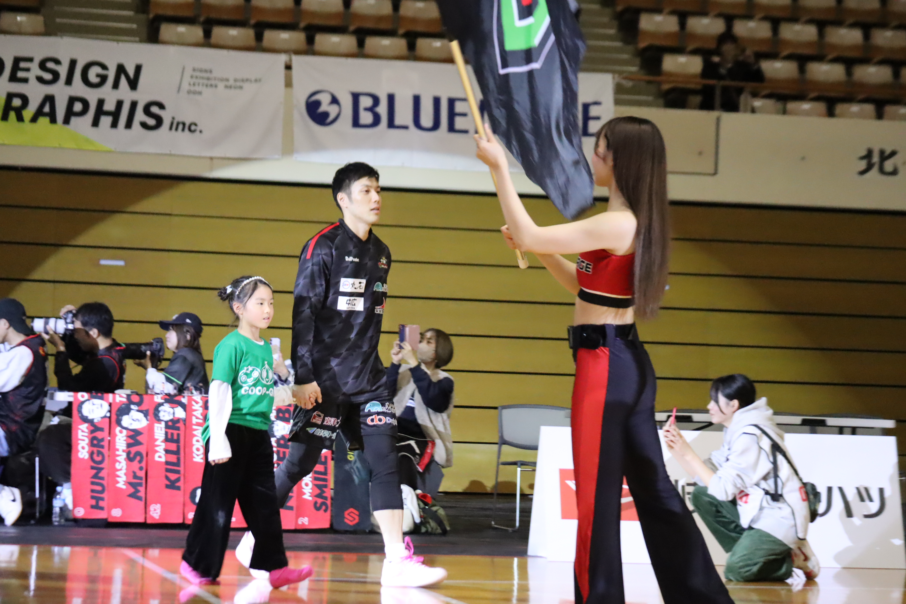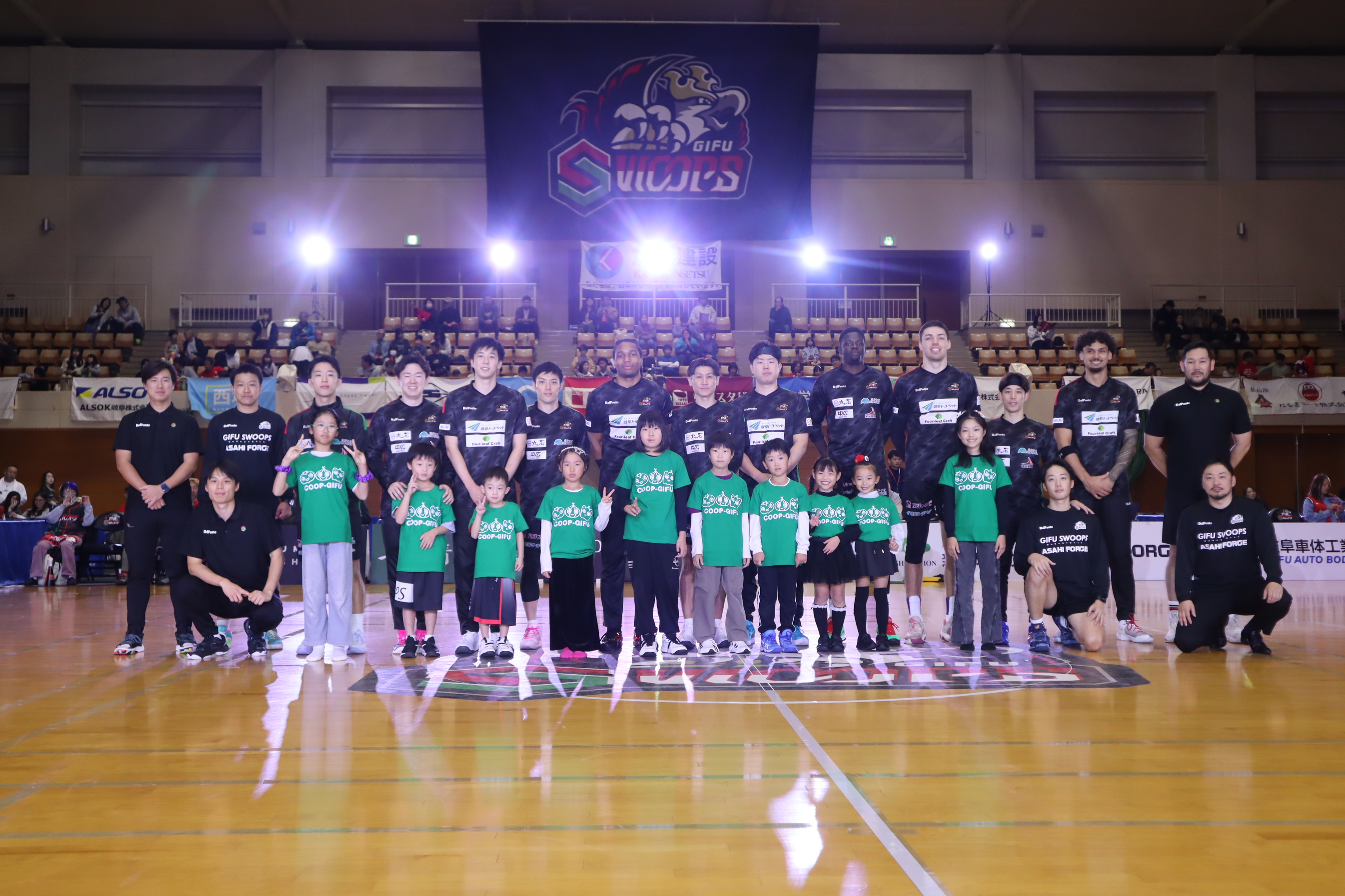 試合開始前の選手入場の際には、週刊コープぎふで募集した「エスコートキッズ」たちが、おそろいのコープぎふTシャツを着て選手たちと一緒に試合コートへ登場!選手と一緒になって手を振ったり、スゥープスのマスコットキャラクターのスパーキーとグータッチしながら、子どもたち全員堂々と入場しました。