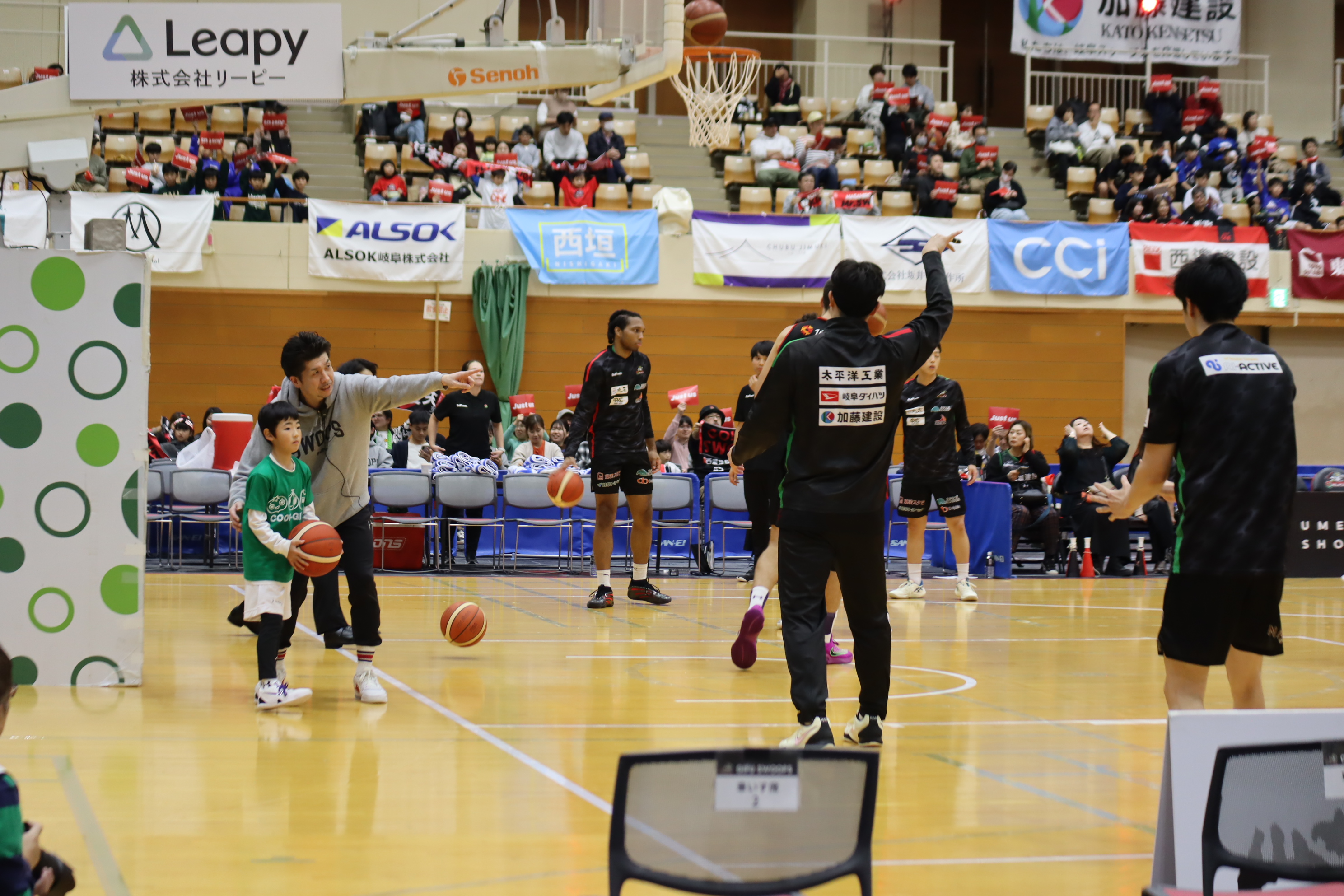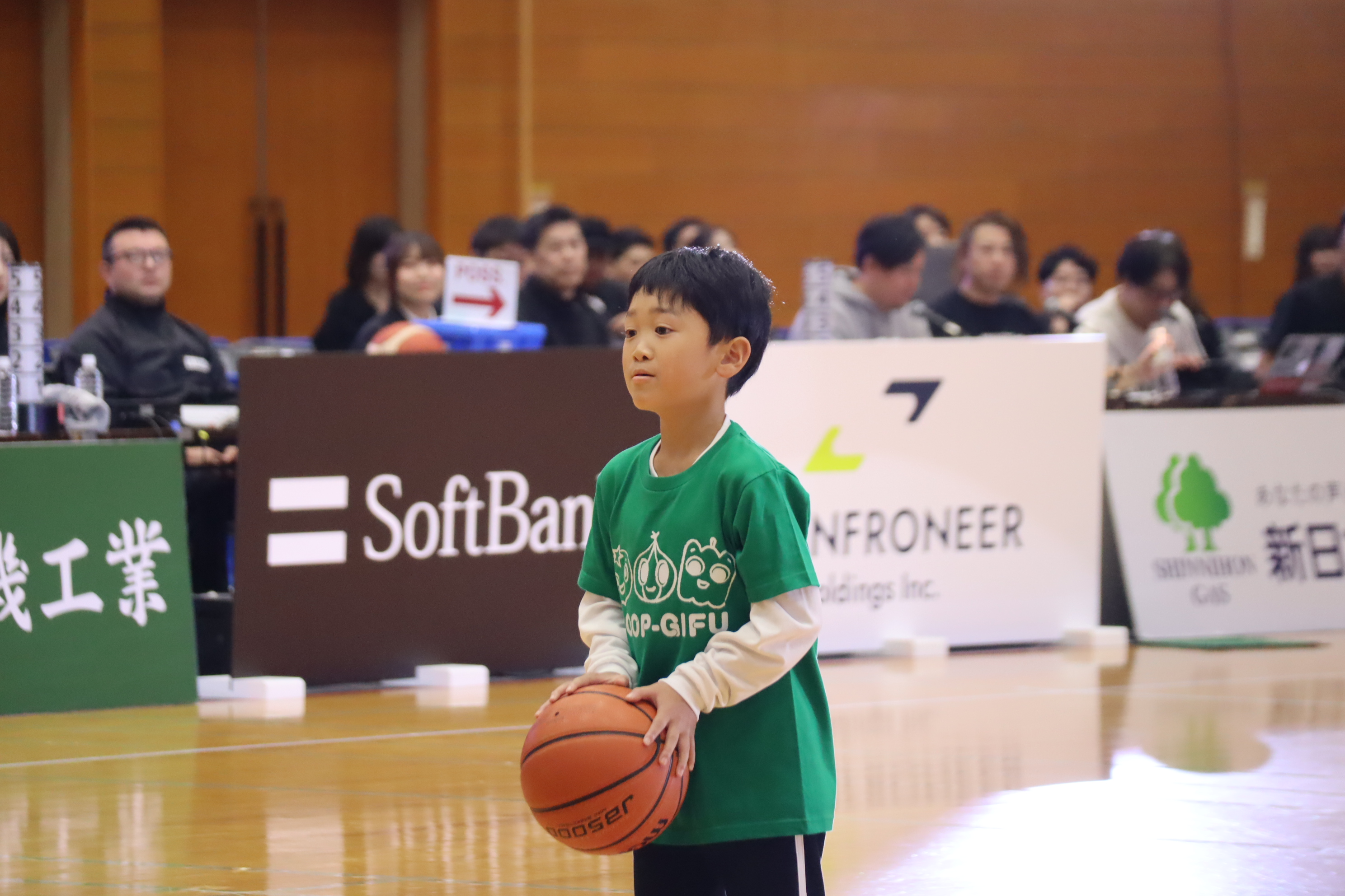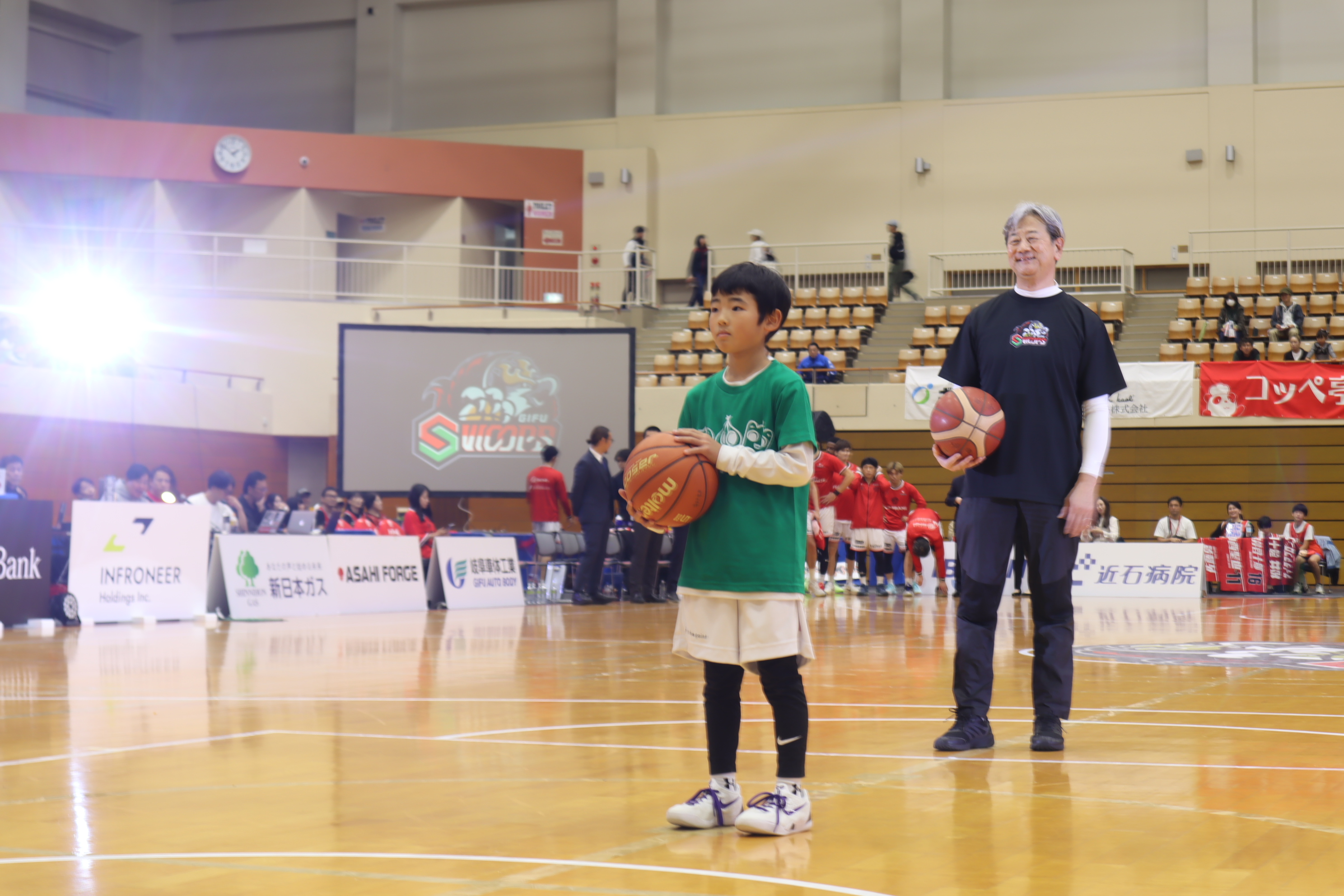 両日行われたティップオフセレモニーでは、下呂市にお住まいの小学生2名が試合の勝利を願い、ゴールを目指してシュートしました。