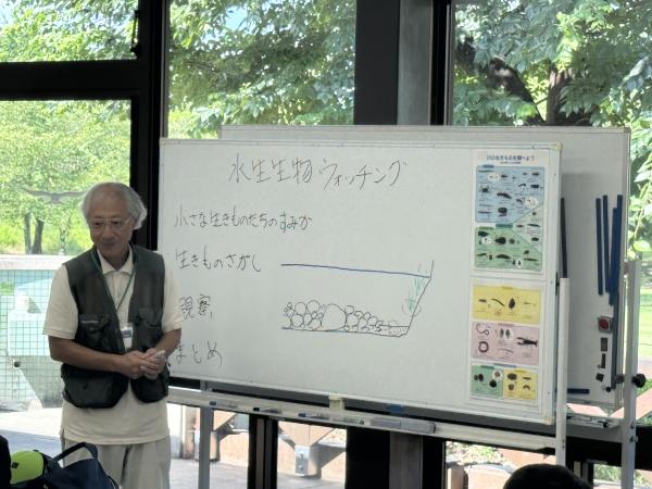 自然発見館の岩井先生(講師)の方に、まずは水生生物がどんな場所にいるか、探し方のコツ、注意点なども教えていただきました。