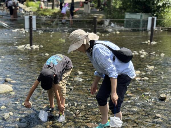 さあ、このイベントでしか入れない川(じゃぶじゃぶの河原)の場所に入り、親子・ご家族みんなで水生生物を探しました。来場者とは別の場所のため、ゆっくり生き物を探すことができるのも、この企画の特徴です。