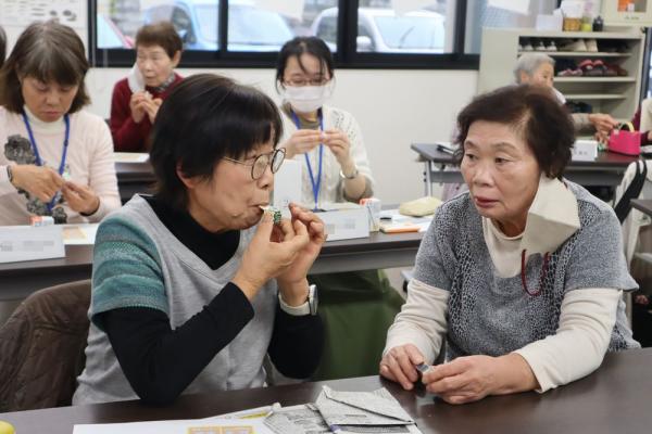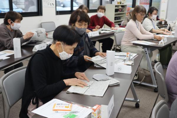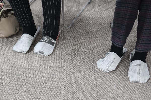 また、体験企画として新聞紙でスリッパ、牛乳パックでホイッスルも作りました。新聞紙でつくるスリッパは意外に暖かく、そのまま履いてお話を聴く方もいらっしゃいました。