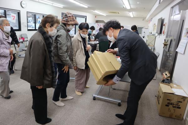 楽しくお話を聴いたり、体験したりしながら防災について学びました。帰りには簡易トイレやヘルメット等、コープで取り扱う防災用品の展示も見ていただきました。