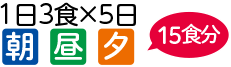 1日3食の場合、朝昼夕となり、15食分となります。朝昼夕は全て別メニューで、毎日メニューが変わります。